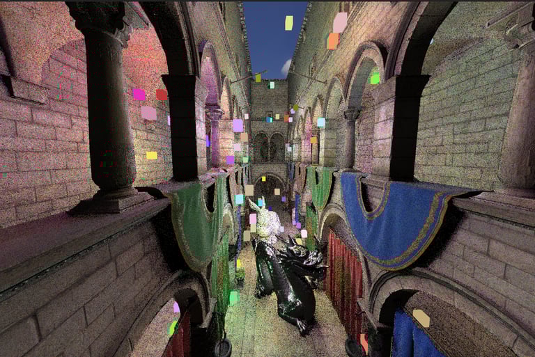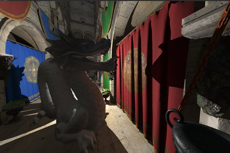 I am also exploring how Screen Space Global Illumination (SSGI) can be coupled with DDGI to resolve high-frequency details that probe-based solutions often miss. To handle the noise inherent in these stochastic methods, I am integrating NVIDIA DLSS Ray Reconstruction as the primary denoising solution. To rigorously evaluate these techniques, I am implementing a reference Path Traced Global Illumination solution. This allows for a direct visual and performance comparison between the hybrid DDGI implementation and a ground truth renderer, providing clear metrics on the fidelity and efficiency of these combined techniques.